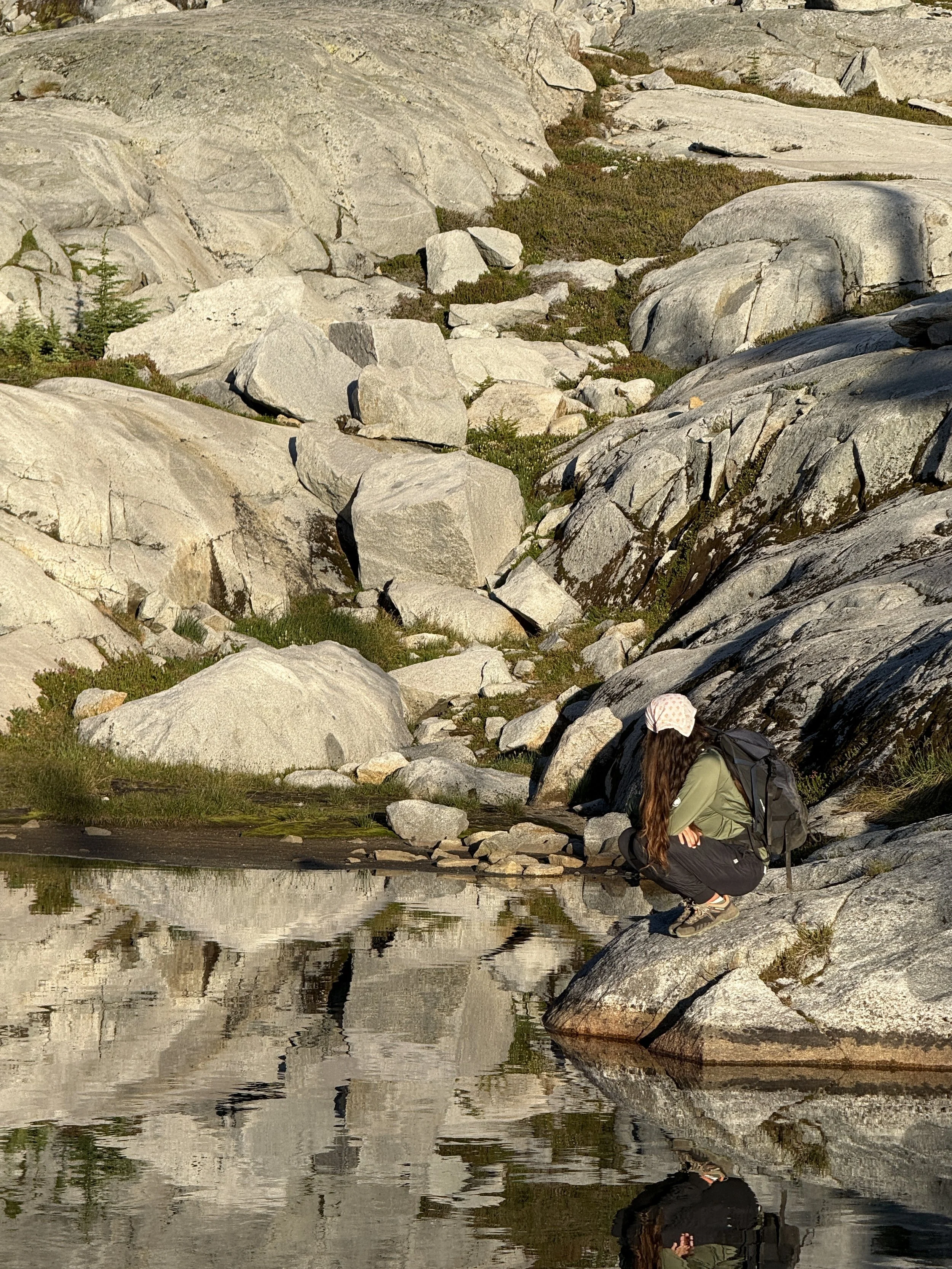 We found a stunning campsite, set up our gear, and wandered the shoreline, watching the trout cruise the glassy surface. (Now accepting mansplaining in the comments below about how this probably wasn’t a trout). Dinner was a hot mess of ramen, cooked on a sunny granite shelf while we waded knee-deep in the lake’s sun-warmed shallows waiting for our noodles to simmer. Pure Washington wilderness woman magic as yes, I did feel like a fairy with the lake shimmering my way.