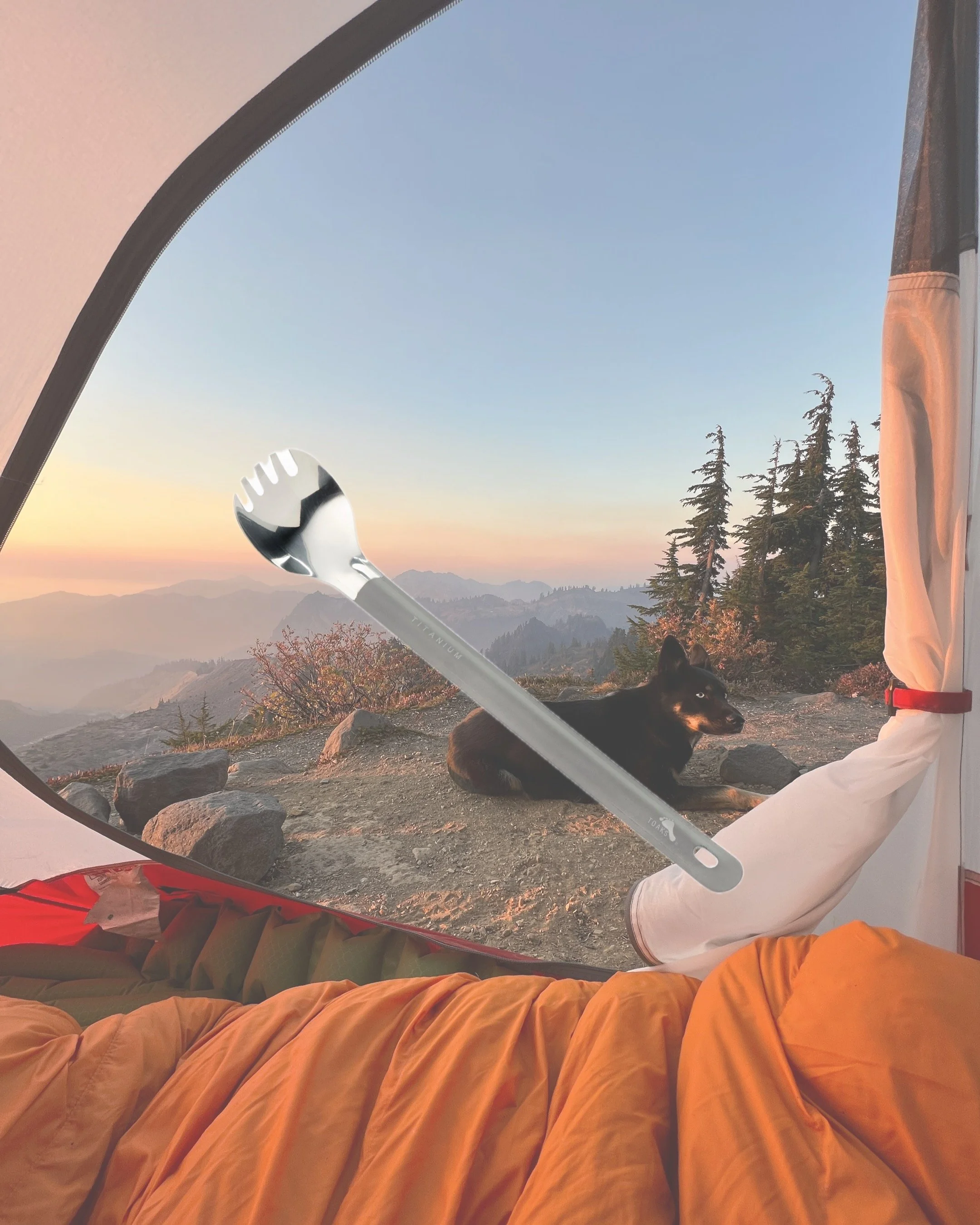 Have you ever dug to the bottom of your backpacking meal while your sleeve soaked up the bolognese on the sides of the bag? This extra long spork is the solution. This is not the brand I have but it' looks the closest to what we’ve got.